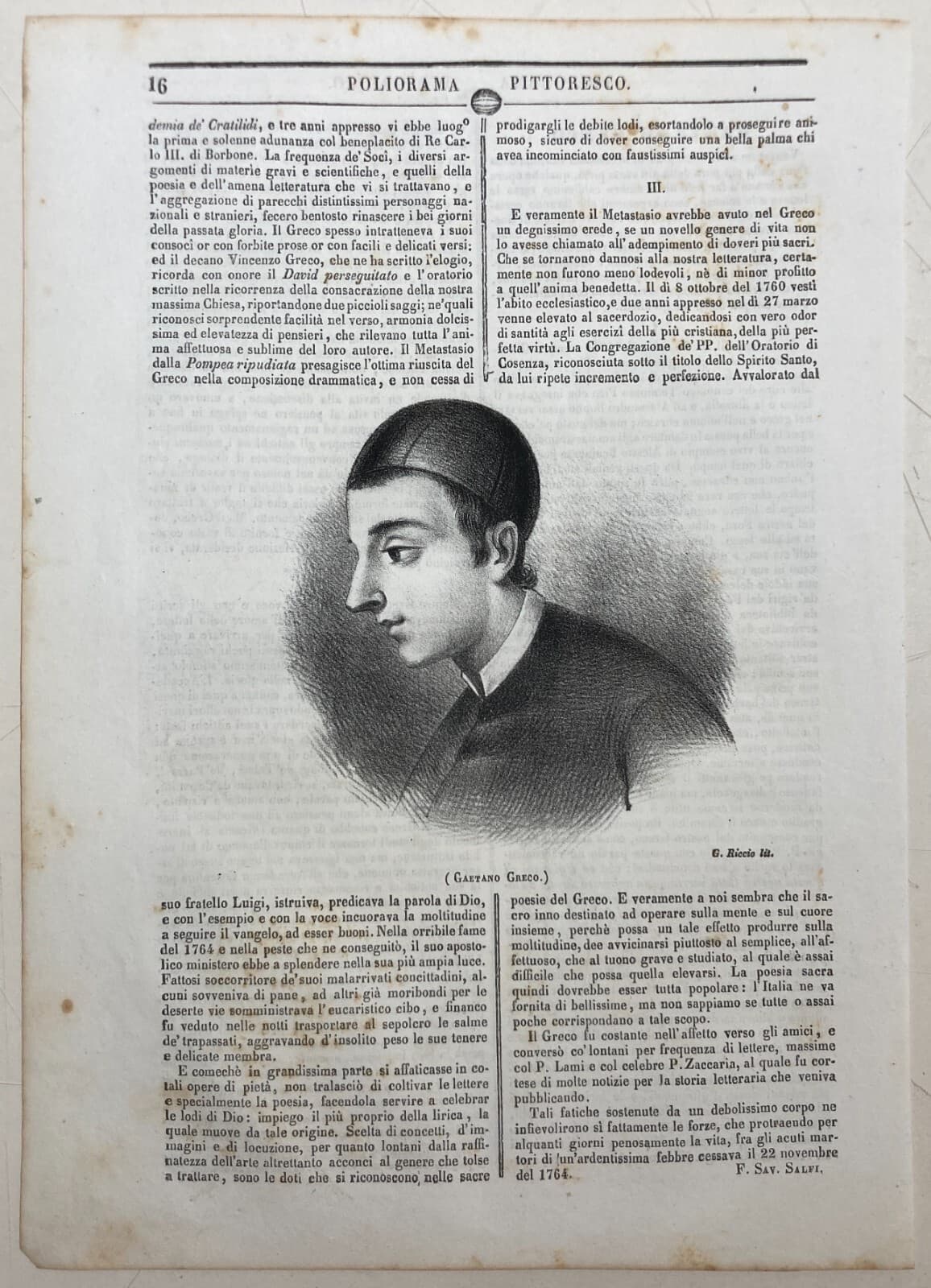 Calabria, Cosenza: Antico Ritratto Di Gaetano Greco, Litografia Dell'800, Riccio