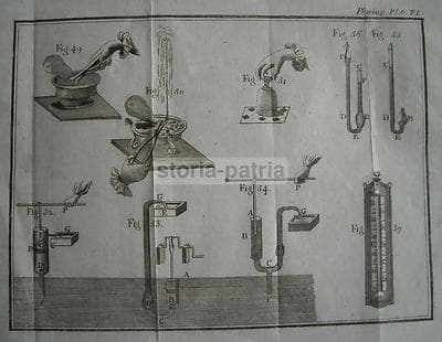Scienza: Fisica, Esperimenti E Strumenti Scientifici Incisione Antica Con Termometro