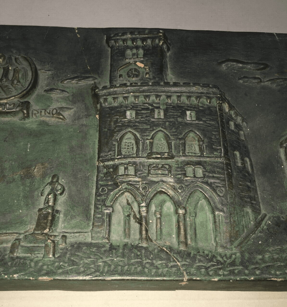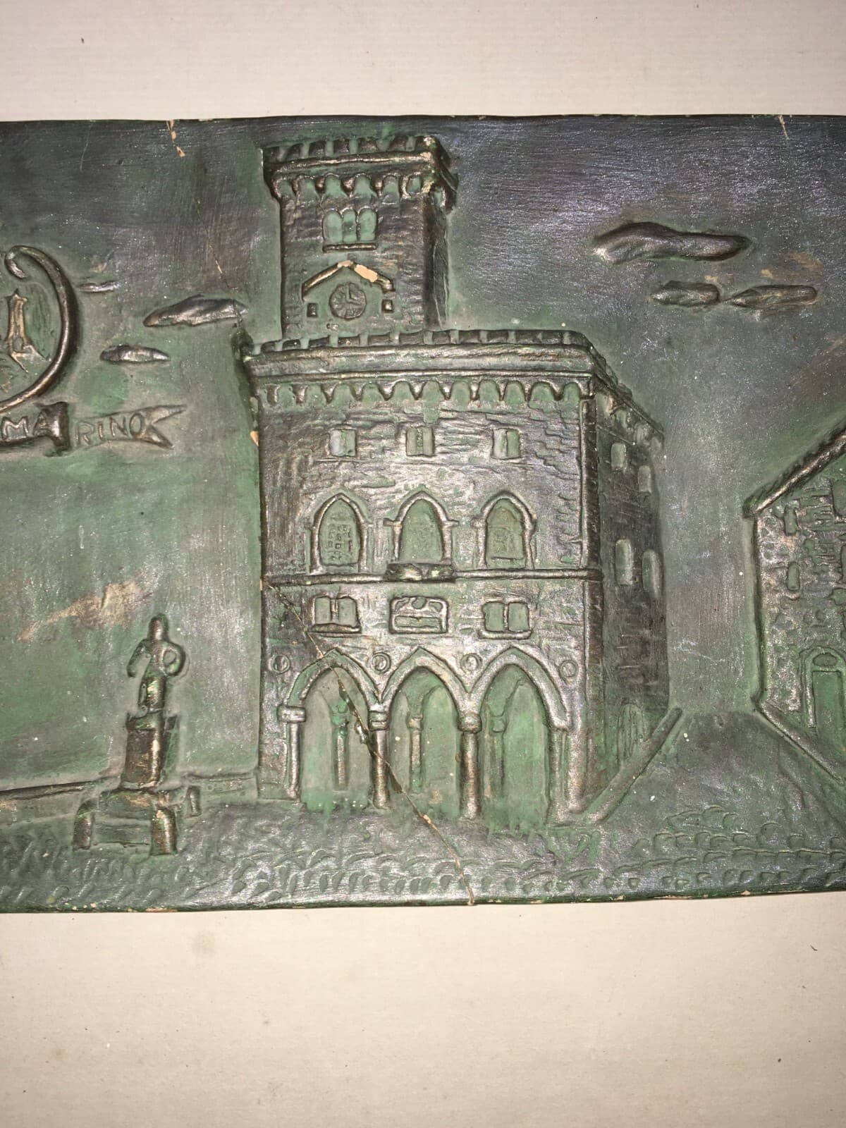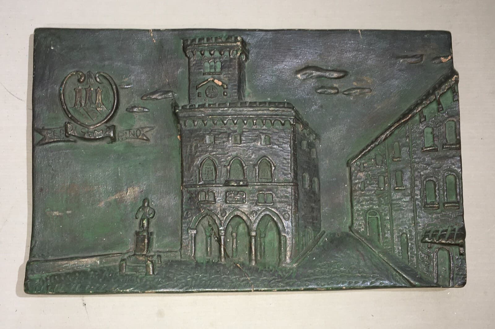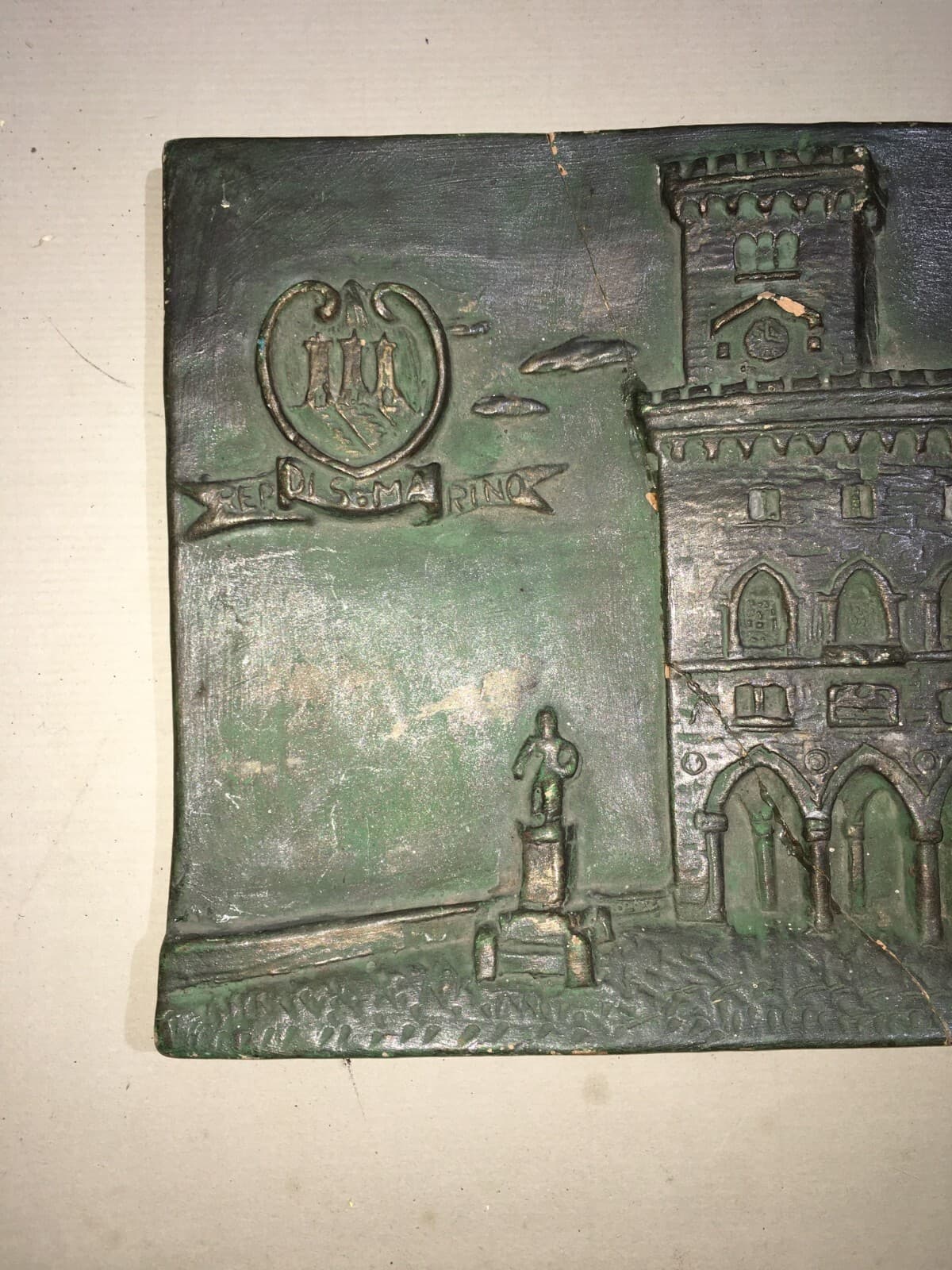 Placca Decorativa In Ceramica Patinata Bronzo, San Marino, Veduta Con Stemma