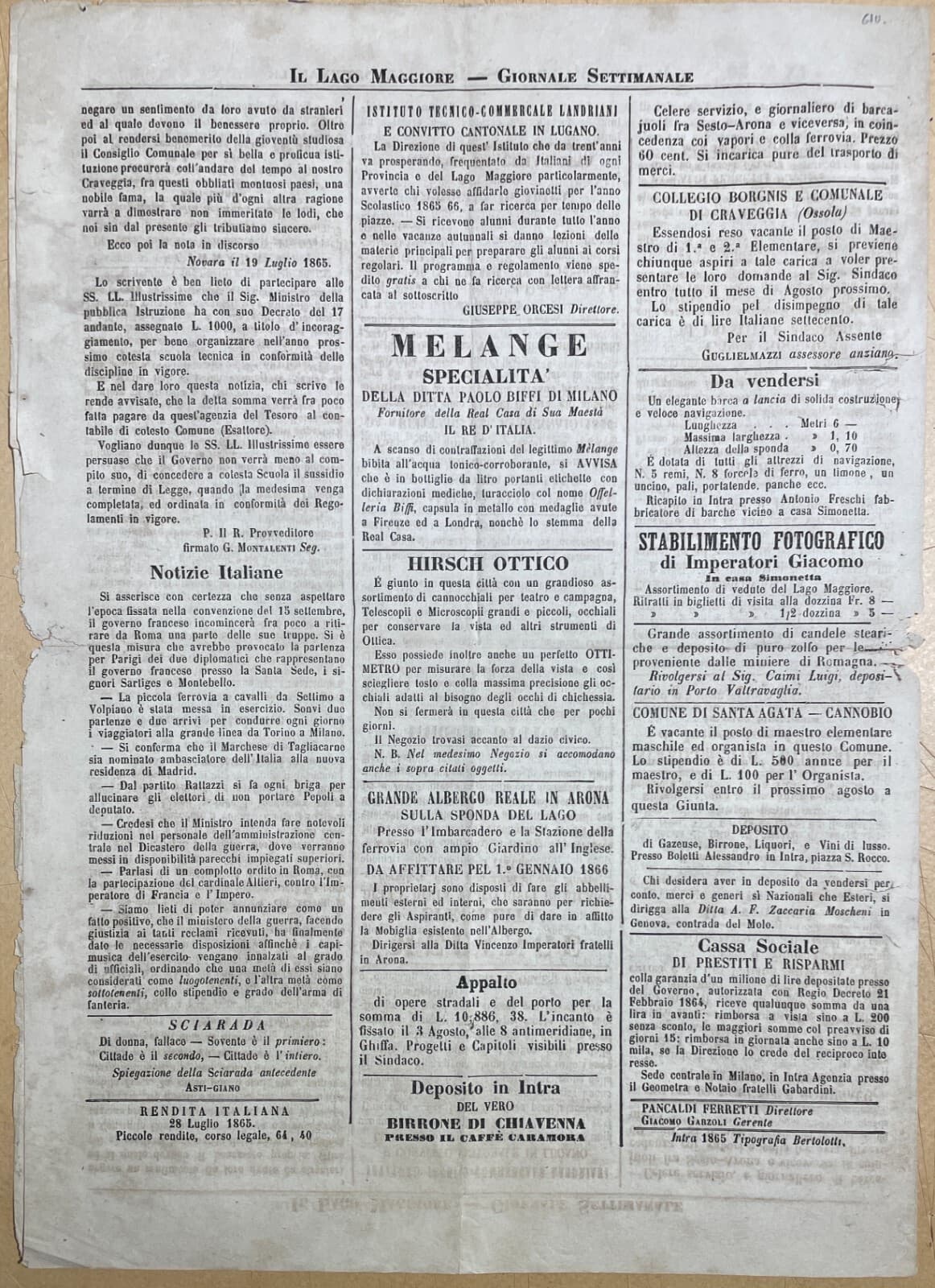 Lago Maggiore, Intra: Antico Periodico, Magnesite, Craveggia, Storia Locale, 1865