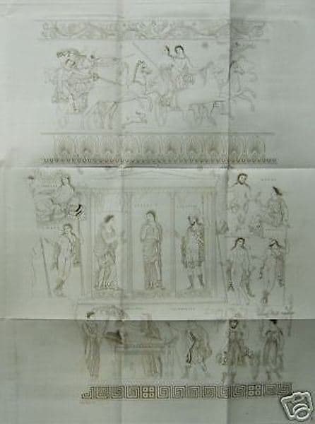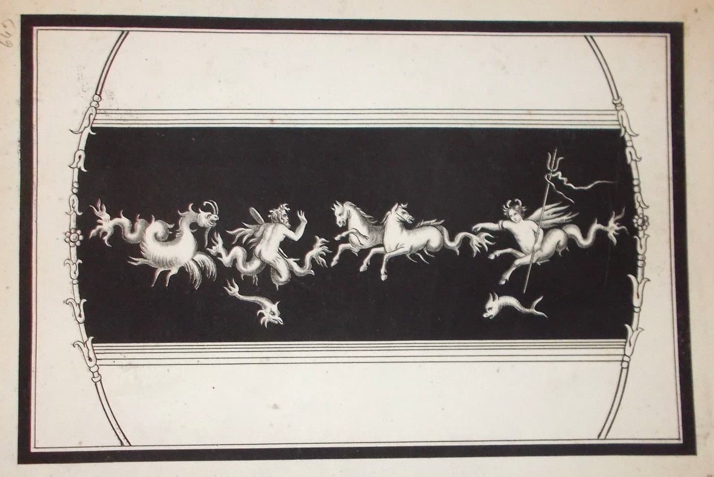 Arte Antica: Decorazione Pompeiana, Allegorie, Drago, Cavalli. Antica Litografia.