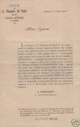 Società San Vincenzo De' Paoli Modena, F. Bentivoglio, 1909. Documento Storico.