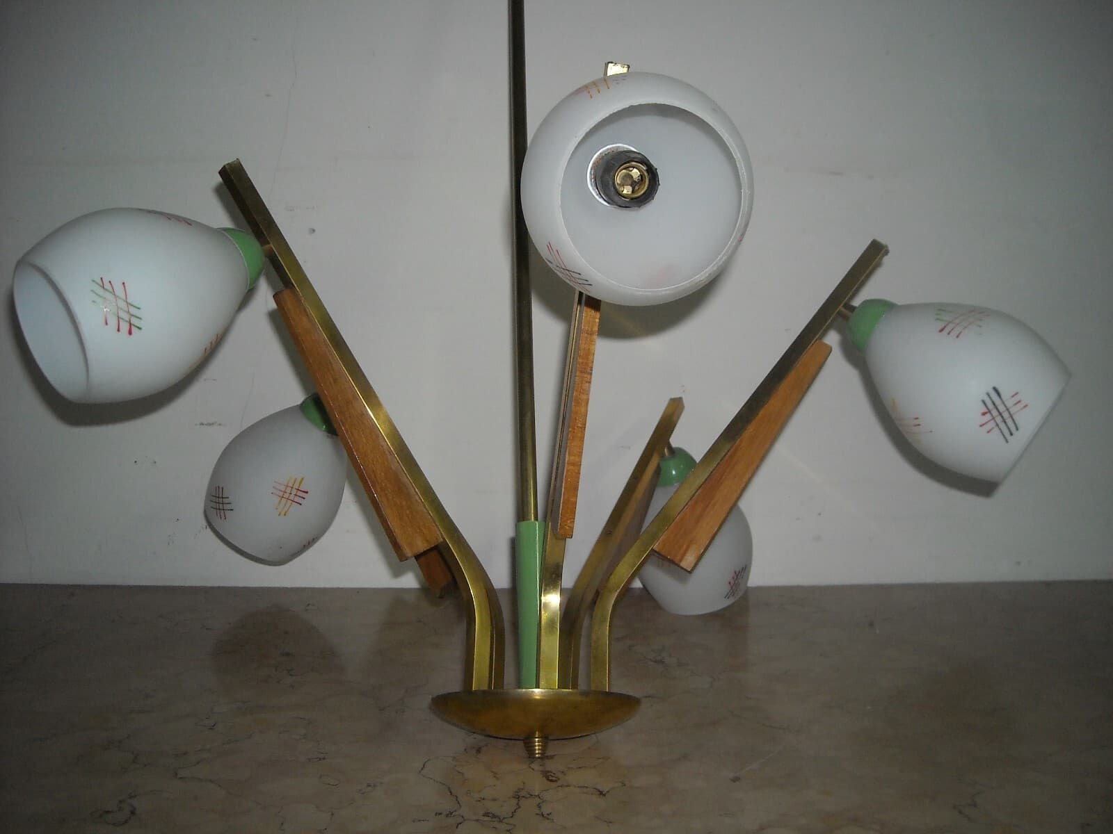 Lampadario A Sei Luci In Ottone Brunito, Legno E Vetro Opalescente