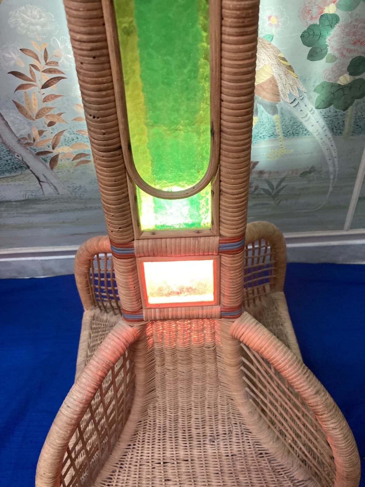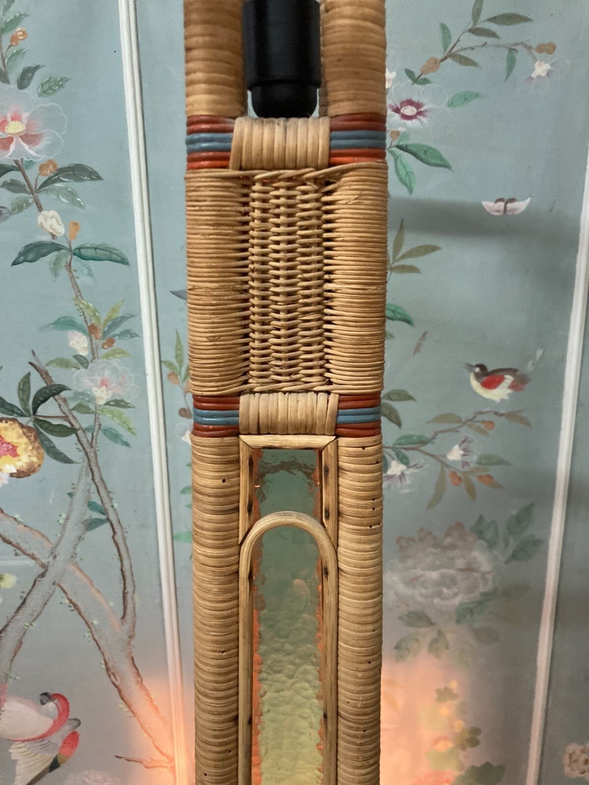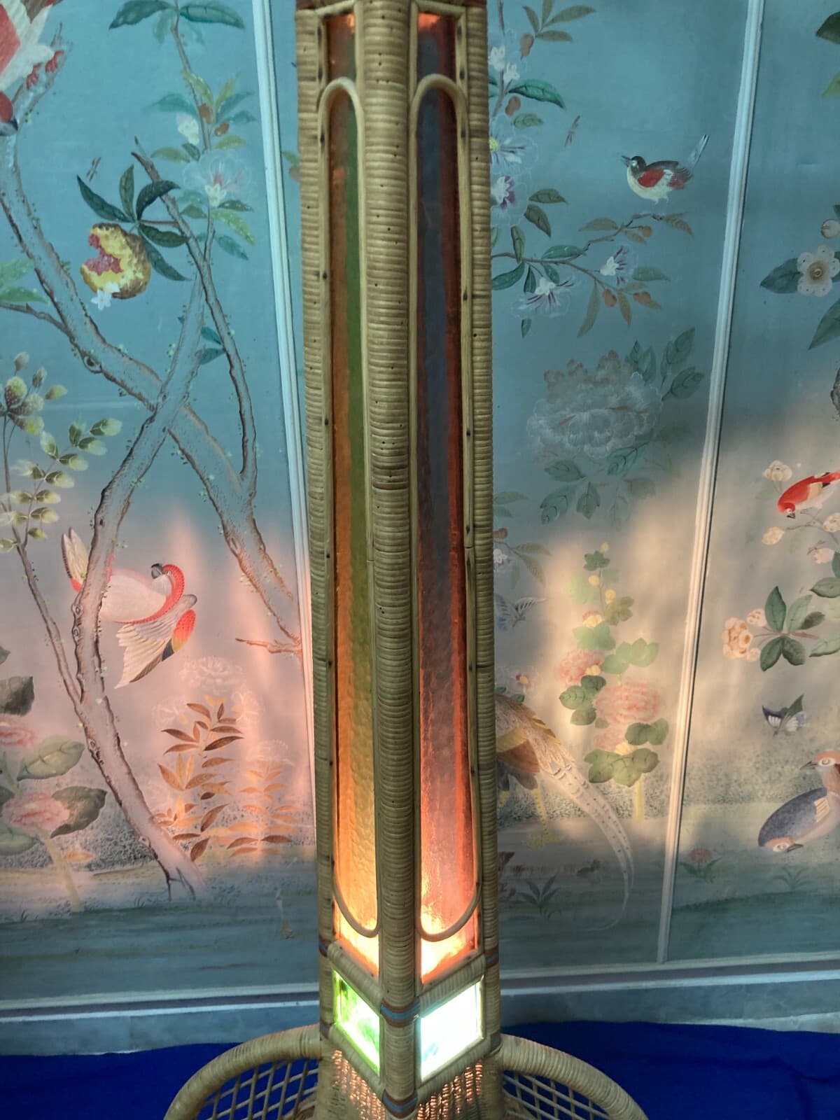 Modernariato, Design, Decorativa Lampada Piantana Con Vetri Colorati In Rattan E Vimini