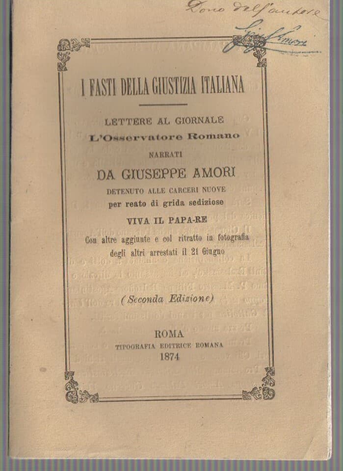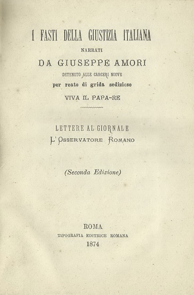 Giuseppe Amori, I Fasti Della Giustizia Italiana (1874) Questione Romana E Arresti In Vaticano