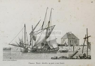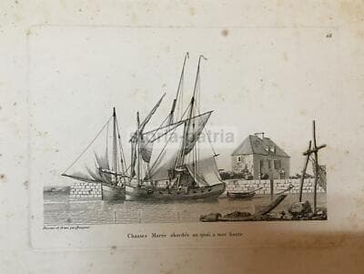 Chasses Marée Abordés Au Quai, À Mer Haute: Veduta Con Barche A Vela, Incisione Di Baugean, Inizio XIX Secolo