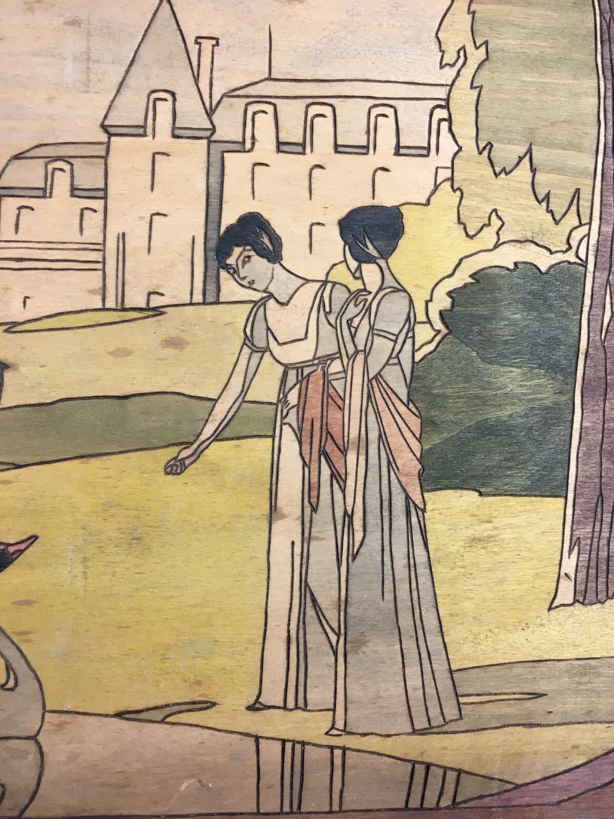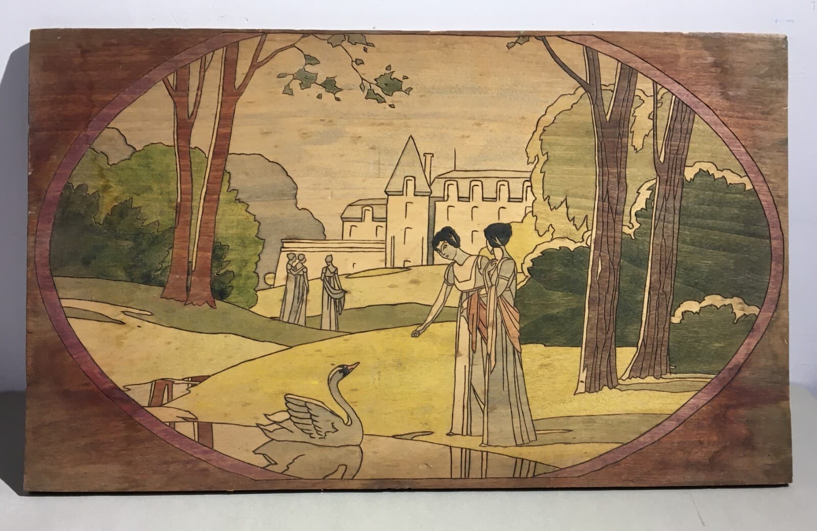 Illustrazione Artistica: Figure Femminili Con Cigno, Pannello Pirografato Stile Liberty