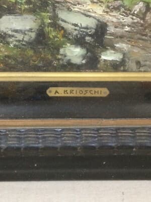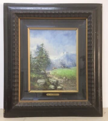 Athos Brioschi, Paesaggio Alpino Con Figure, Olio Su Cartone In Cornice Ebanizzata