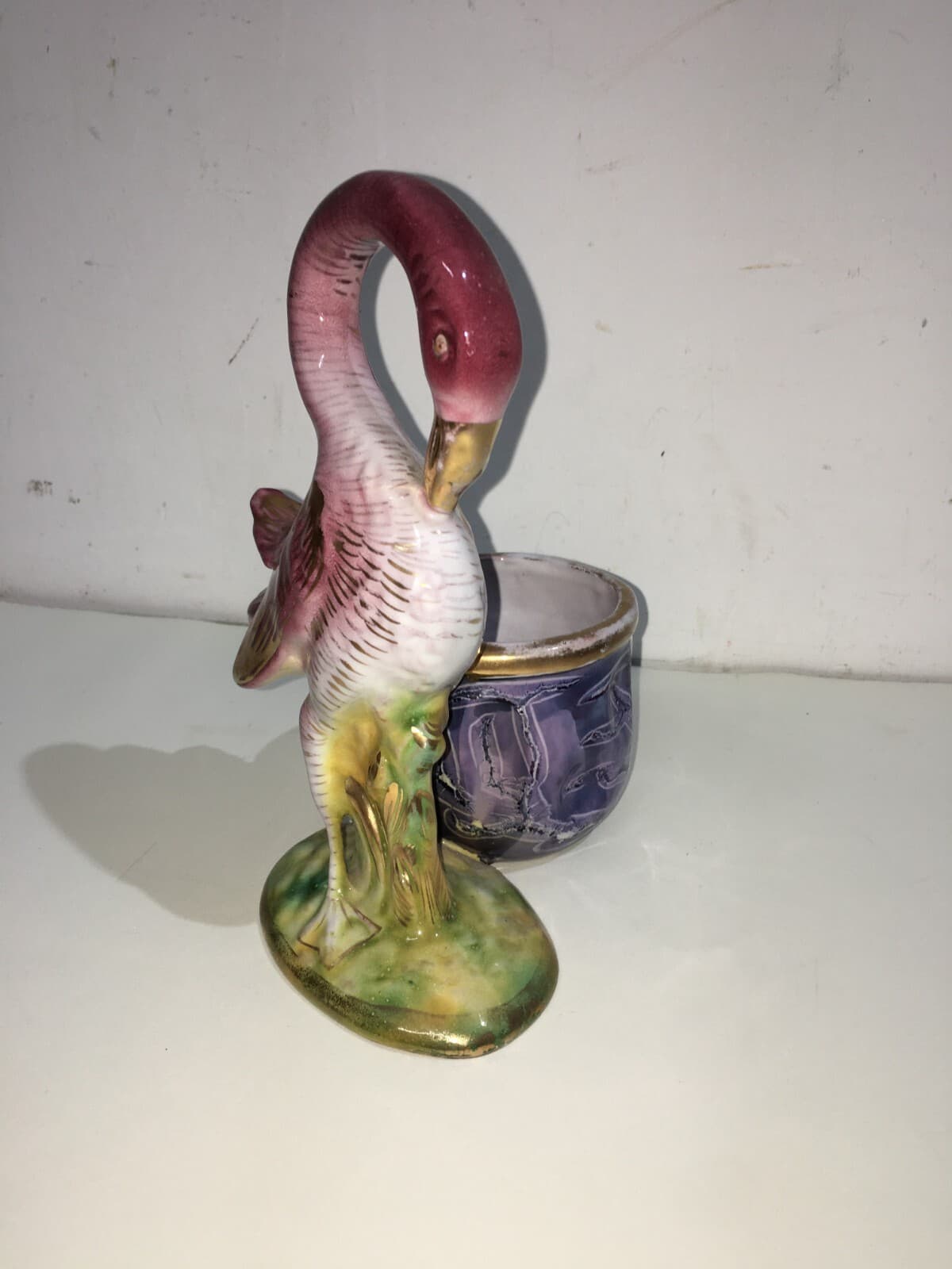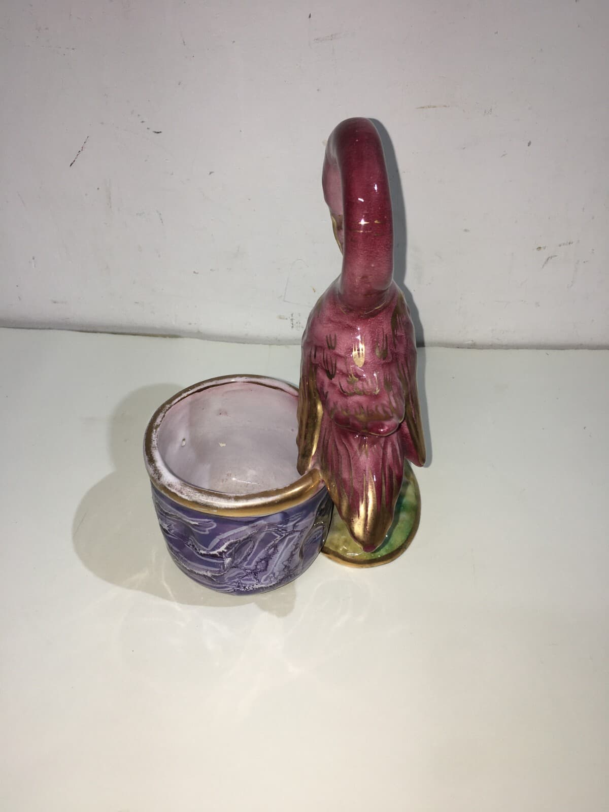 Soprammobile In Ceramica Con Figure Di Paperi E Cestino Svuotatasche