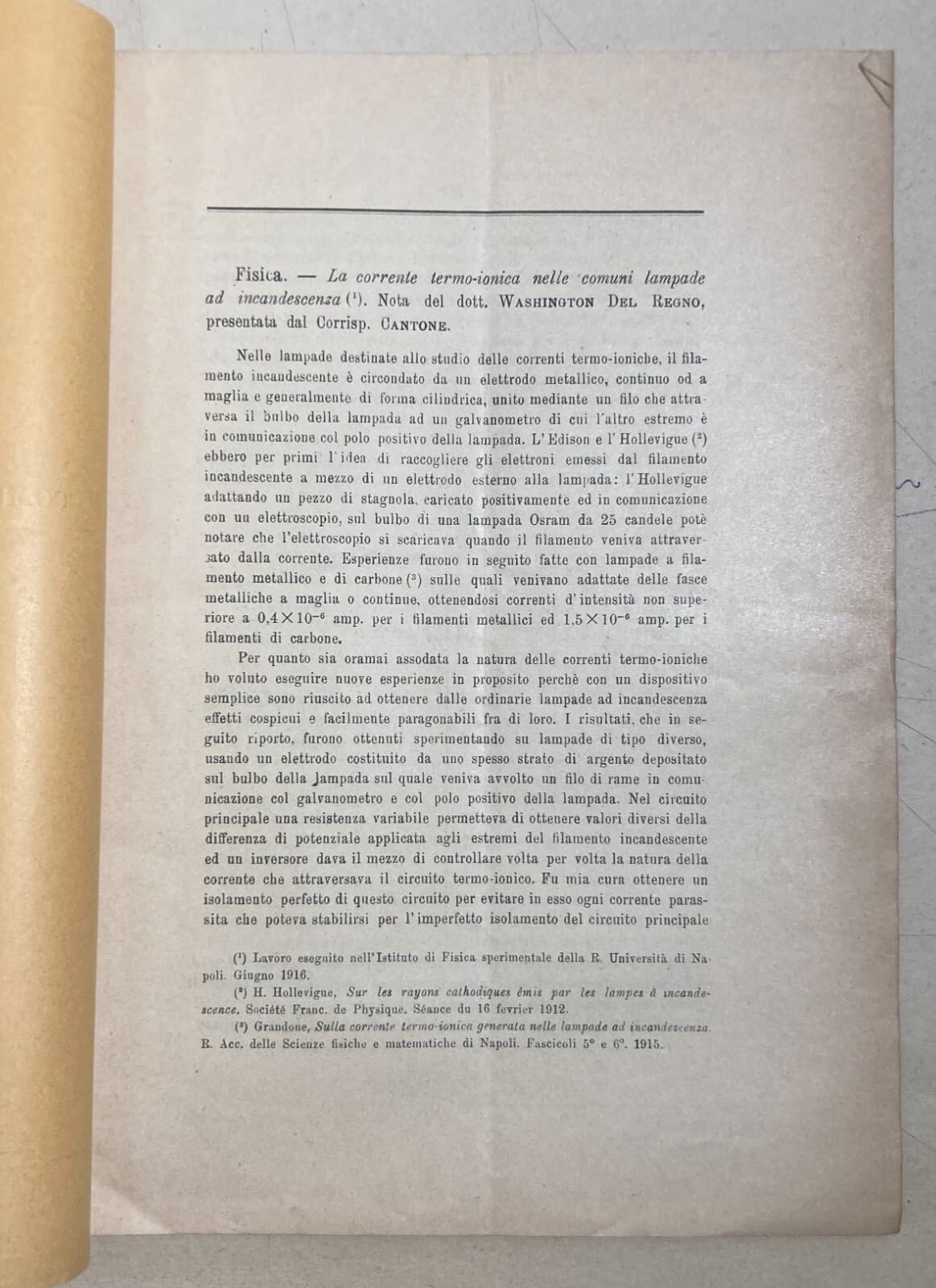 Washington Del Regno, La Corrente Termo Ionica Nelle Comuni Lampade Ad Incandescenza, Roma, 1917