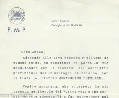 Campania, Salerno, Capriglia, Pellezzano: Volantino Propaganda Elettorale Monarchia