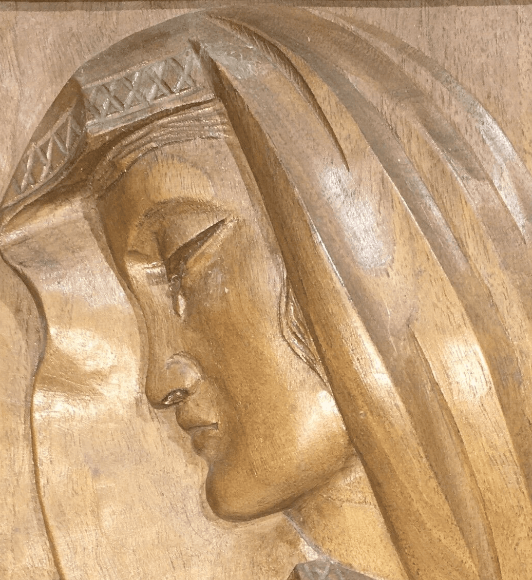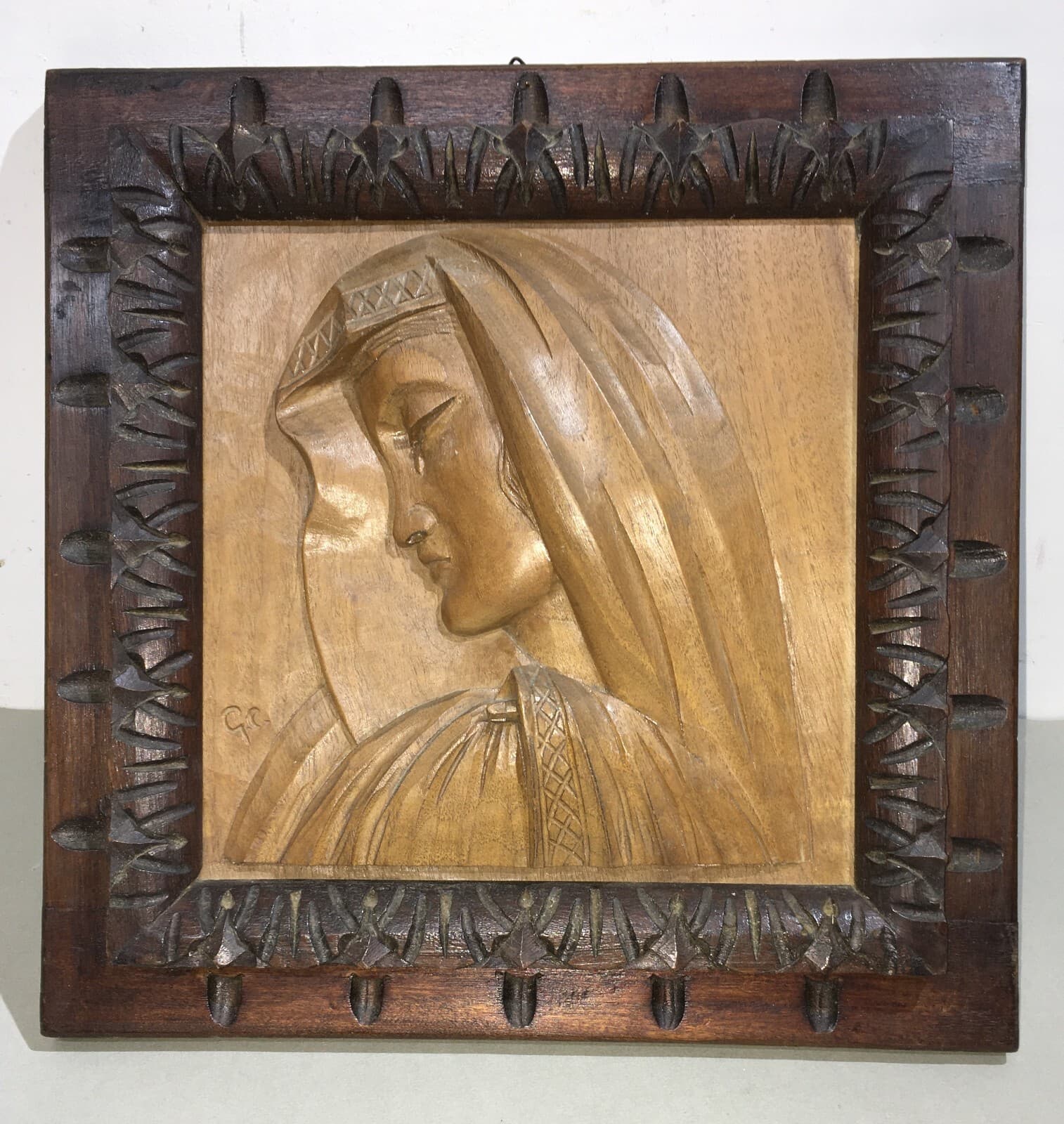 Scultura In Legno Intagliato Con Figura Devozionale Dell'Addolorata, Siglata GC, Metà Del XX Secolo