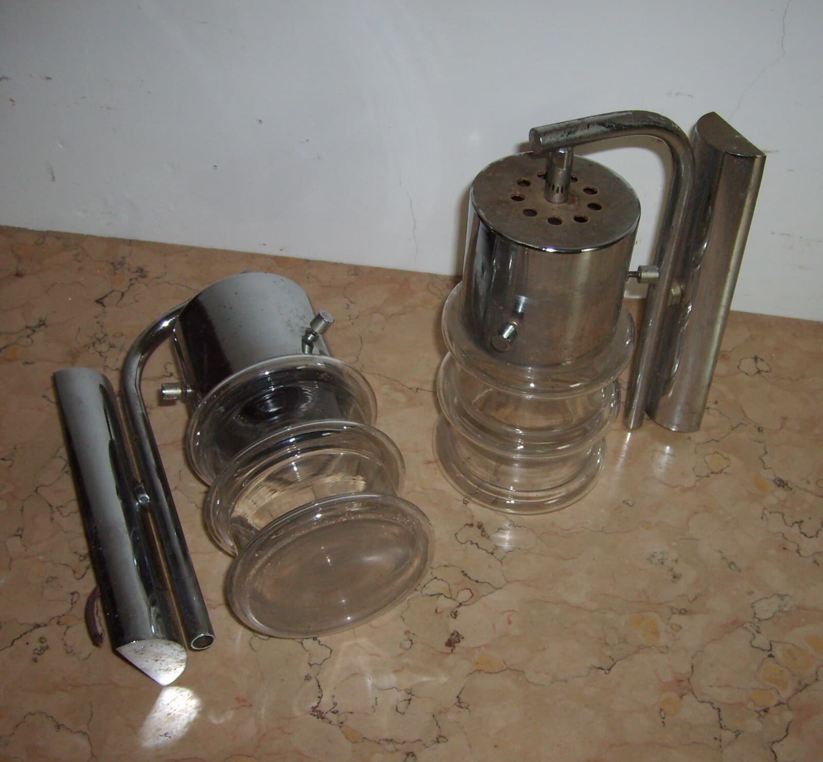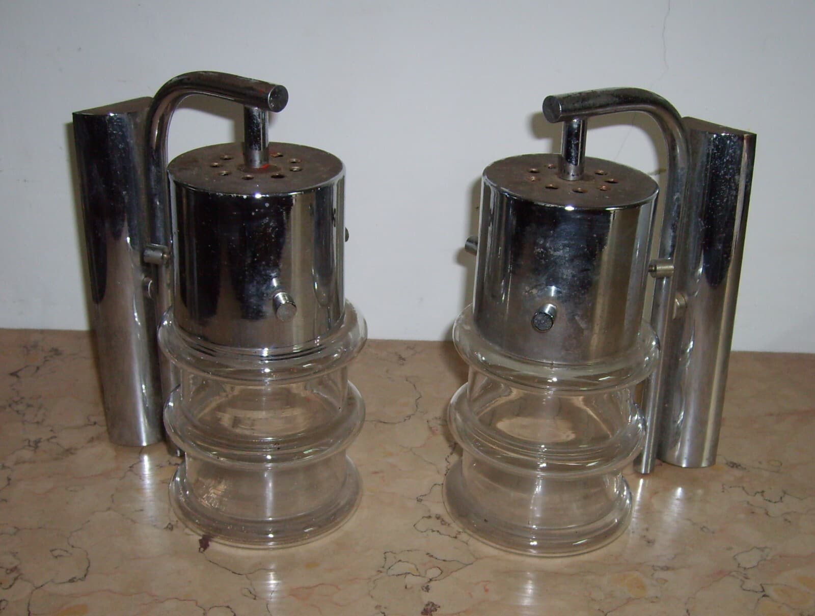 Coppia Di Lampade Da Parete In Metallo Cromato E Vetro, Design Italiano Anni '60 '70