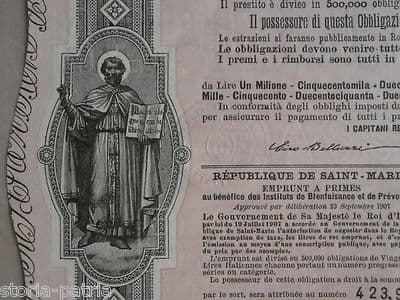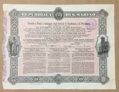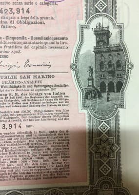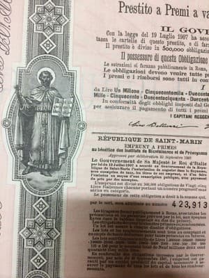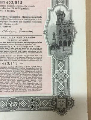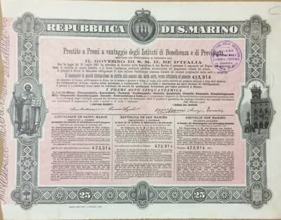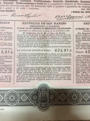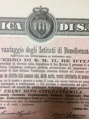 San Marino, Certificato Di Prestito A Premi, Lotteria E Araldica, 1908