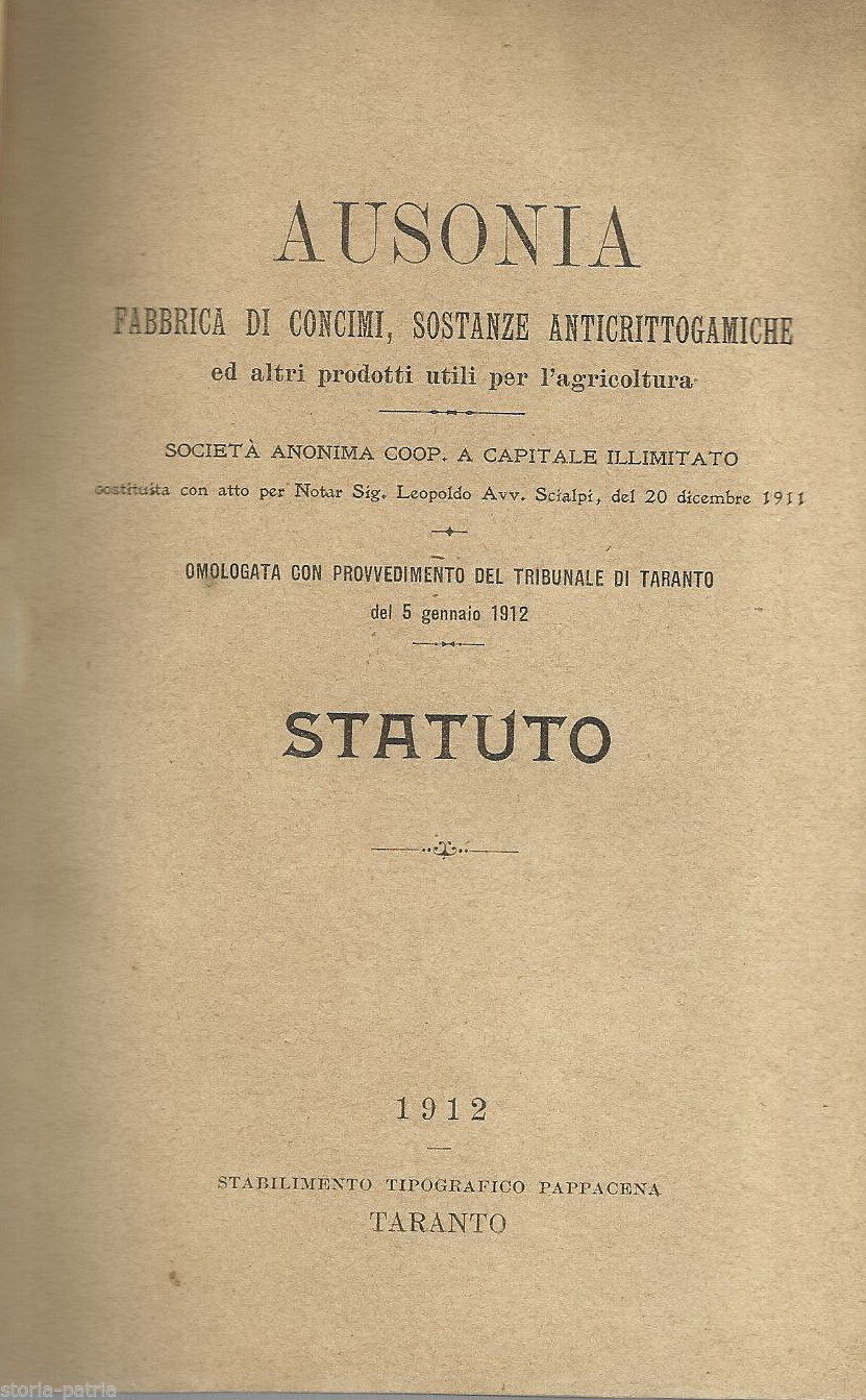 Puglia, Taranto, Agricoltura, Chimica, Concimi, Societa Ausonia, Raro Statuto, 1912