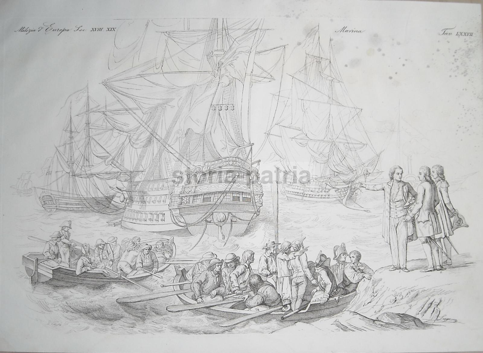 Marineria, Navi, Antichi Velieri, Milizia Deuropa, Animata Veduta, Antica Incisione