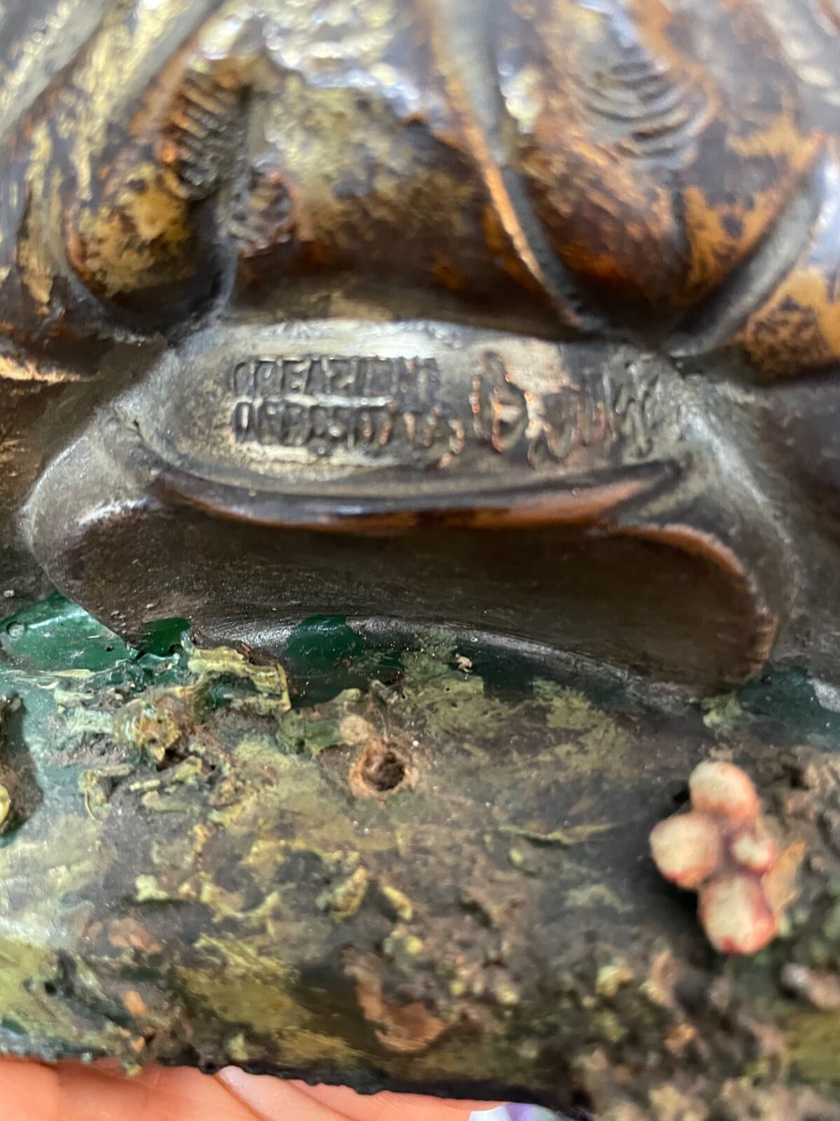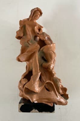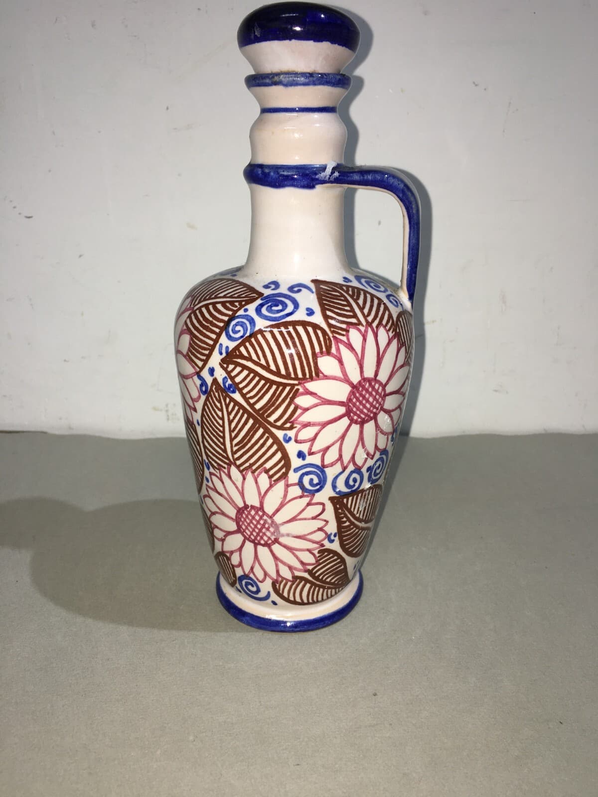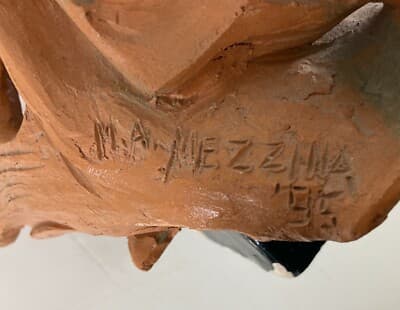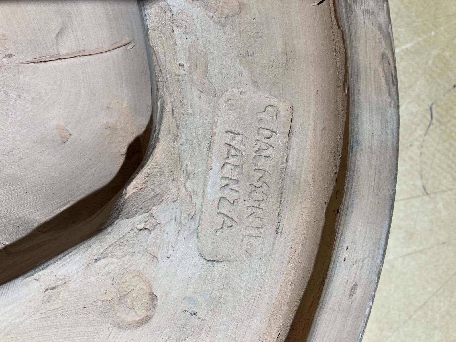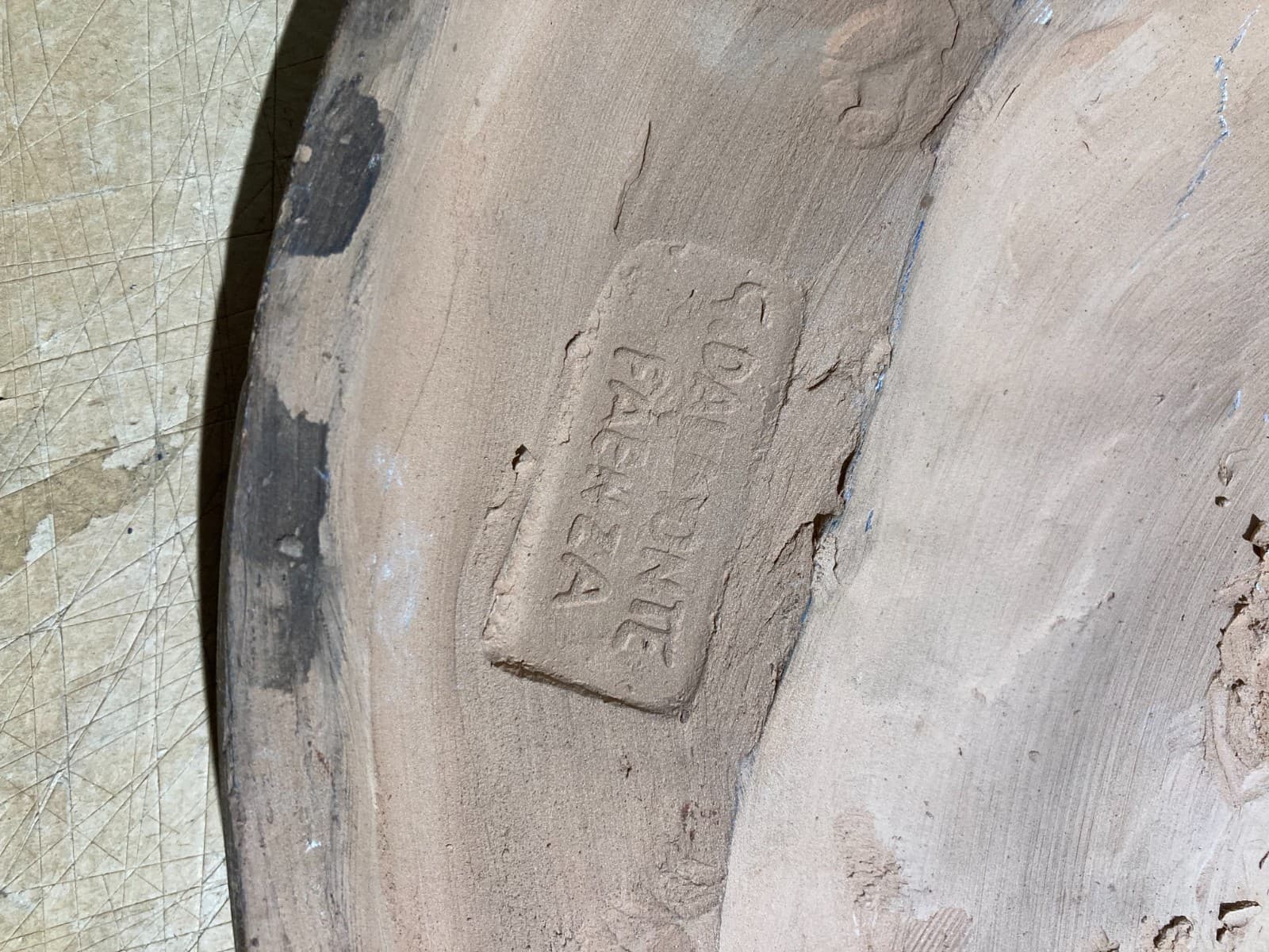 Interessante tazza con piattino in ceramica, caratterizzata da un decoro policromo tipicamente futurista eseguito con tecnica all'aerografo. L'opera è ascrivibile al noto artista futurista napoletano **Francesco Cangiullo**. * **Dimensioni:** piattino (diametro 14,5 cm), tazza (altezza 6,5 cm, diametro 7 cm, ampiezza massima 10 cm). * **Firma:** Sotto la base riporta il marchio "ALBISOLA / B.V. / CHILLE", riferibile alla produzione ceramica di *Albissola*. * **Epoca:** Risalente alla prima metà o metà del XX secolo. * **Condizioni:** Conservazione discreta, con segni d'uso, tracce di polvere e lievi difetti d'epoca visibili nelle immagini.