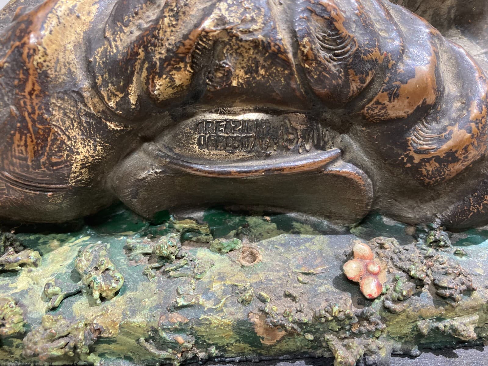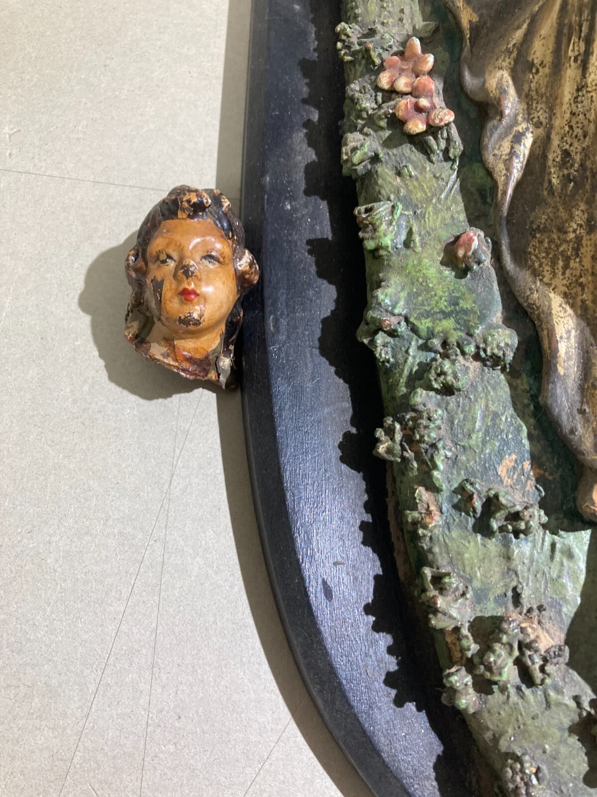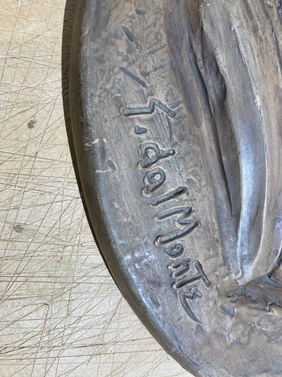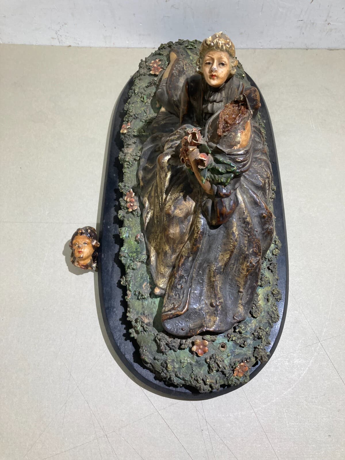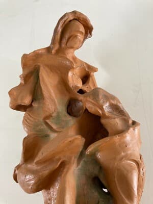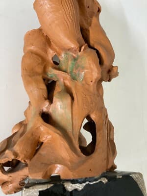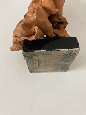 Interessante tazza con piattino in ceramica, caratterizzata da un decoro policromo tipicamente futurista eseguito con tecnica all'aerografo. L'opera è ascrivibile al noto artista futurista napoletano **Francesco Cangiullo**. * **Dimensioni:** piattino (diametro 14,5 cm), tazza (altezza 6,5 cm, diametro 7 cm, ampiezza massima 10 cm). * **Firma:** Sotto la base riporta il marchio "ALBISOLA / B.V. / CHILLE", riferibile alla produzione ceramica di *Albissola*. * **Epoca:** Risalente alla prima metà o metà del XX secolo. * **Condizioni:** Conservazione discreta, con segni d'uso, tracce di polvere e lievi difetti d'epoca visibili nelle immagini.