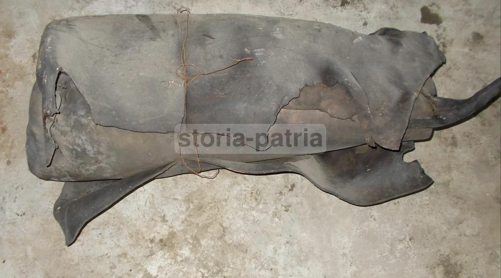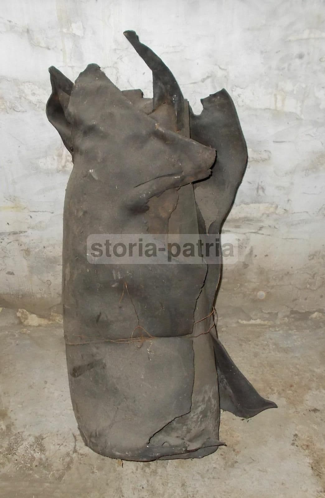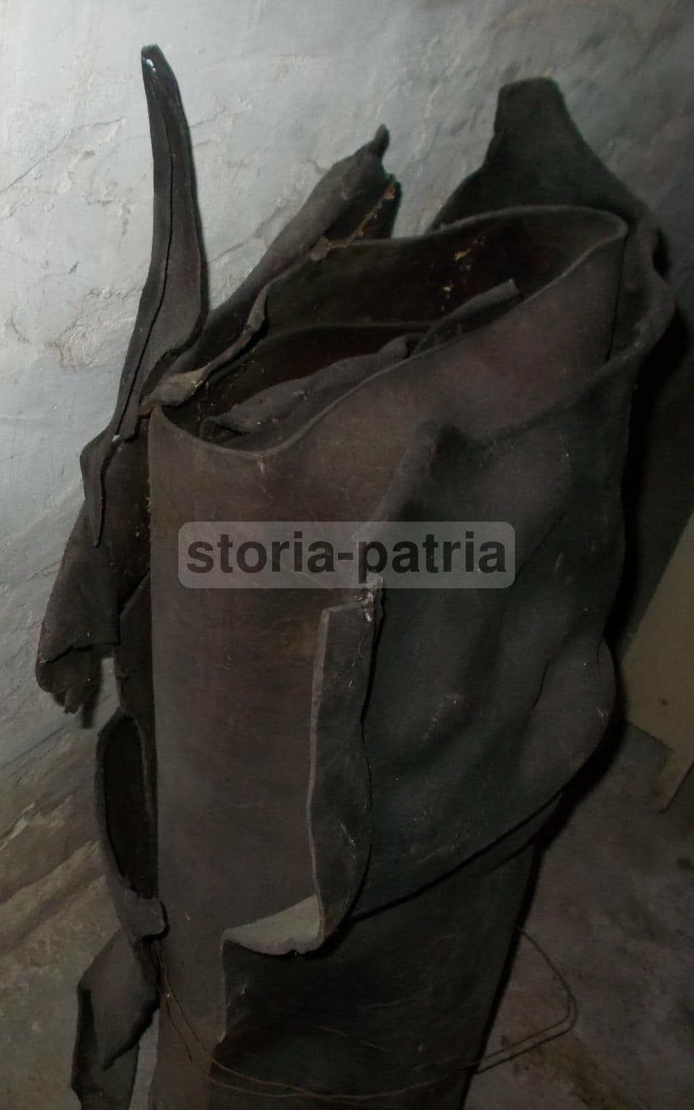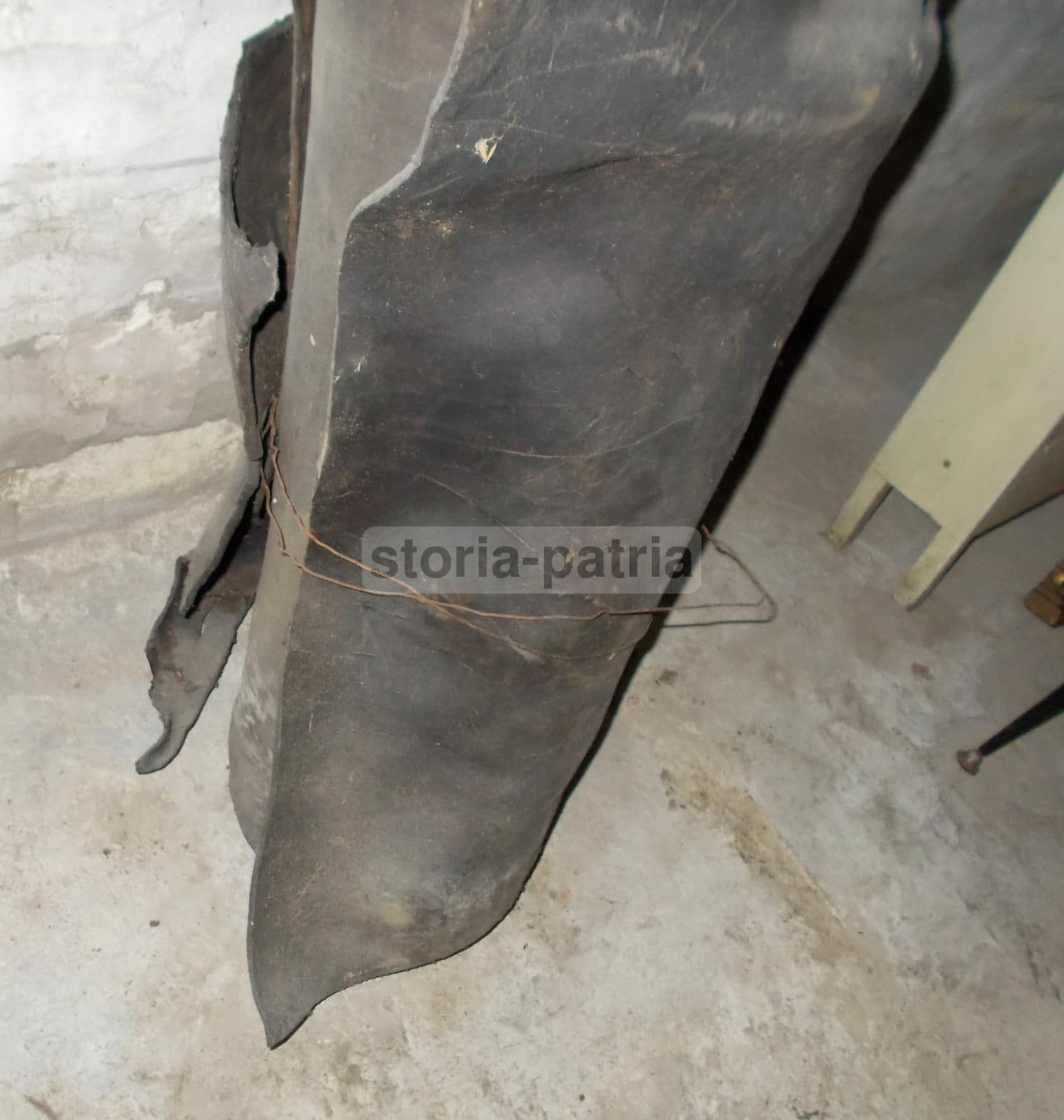 **Antico rotolo di cuoio** rinvenuto nella soffitta di un palazzo gentilizio dell'*Italia Meridionale*. Probabile materiale destinato a: * **Selleria** (selle di cavalli o muli). * **Calzoleria** (tomaie e suole). * **Tappezzeria** (fondi di sedie o poltrone). * **Legatoria** (rilegatura di volumi e registri). Caratteristiche tecniche: * **Dimensioni**: altezza approssimativa di circa un metro. * **Stato**: mai srotolato, cuoio indurito e brunito dal tempo. * **Epoca**: probabile XIX secolo o antecedente. Conservazione: modesta, con segni di usura, abrasioni e macchie tipiche del lungo stazionamento in soffitta. Ideale per musei del pellame, artigiani e restauratori.